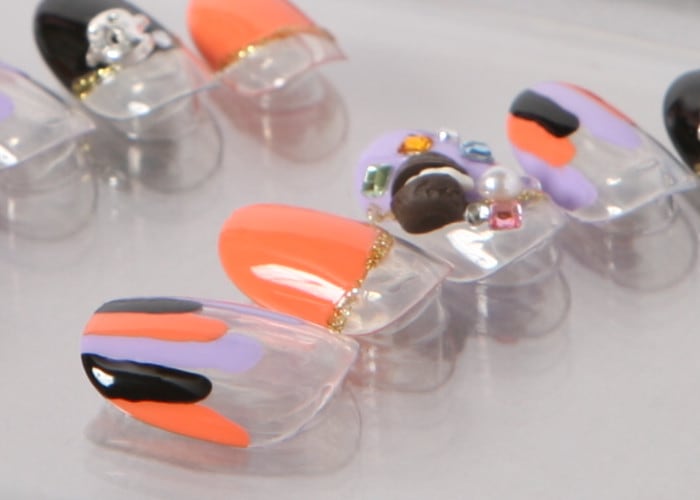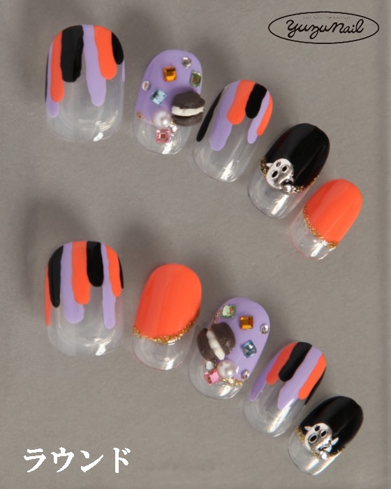 (形)ラウンド(デザイン)マカロンとゴーストの楽しいネイル。トップコート:ゆずネイル特製のジェルコーティングです。肉厚でぷるんとした質感で、柔らかく着け心地が良いです。使用パーツ:ストーン 粘土 スタッズ ラメゴールド パール 。ご利用シーン:ハロウィン 。
