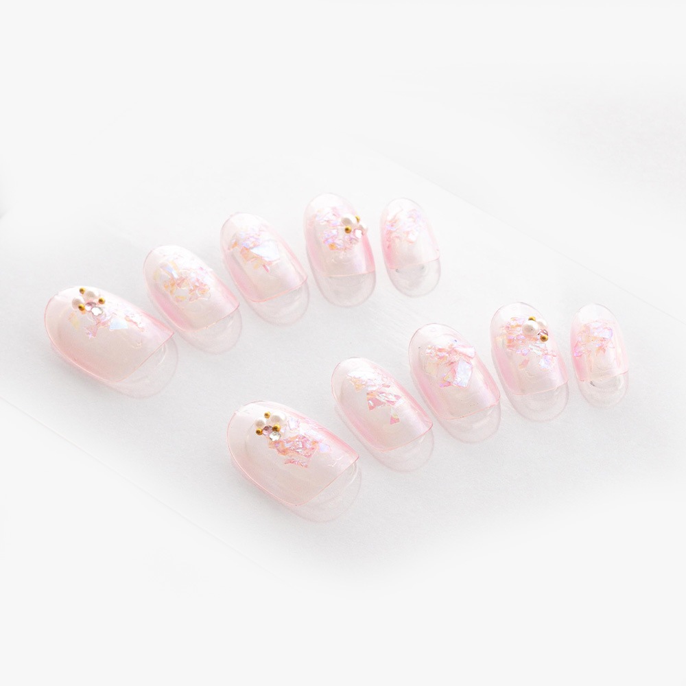 (形)ラウンド(デザイン)オーロラクリアピンクに虹色フレークとビジュートップコート:ゆずネイル特製のジェルコーティングです。肉厚でぷるんとした質感で、柔らかく着け心地が良いです。ご利用シーン:デート ドレス 結婚式(お呼ばれ・ゲスト) 。