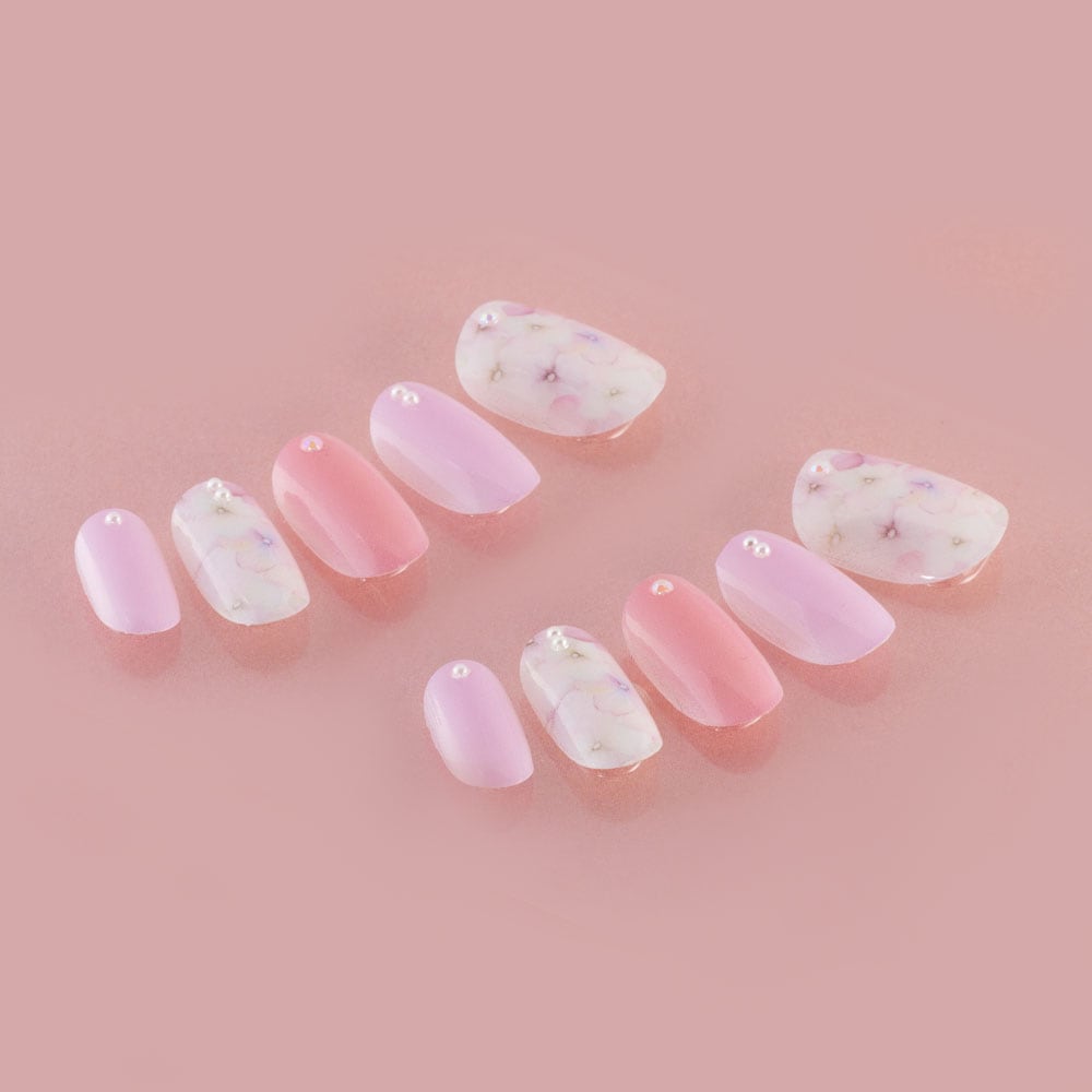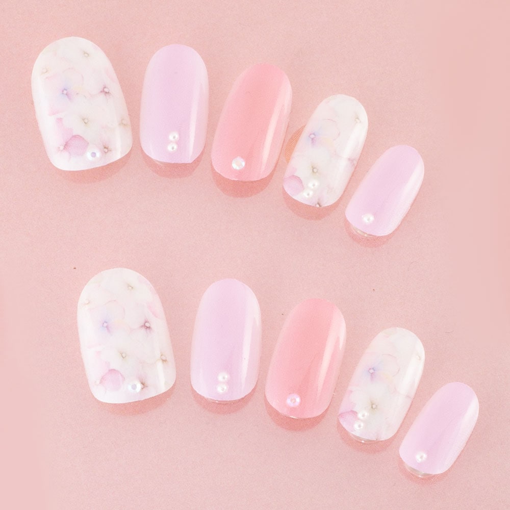 (形)ラウンド(デザイン)アジサイネイル。ピンクやパープルのグラデーションが綺麗なデザイン。トップコート:ゆずネイル特製のジェルコーティングです。肉厚でぷるんとした質感で、柔らかく着け心地が良いです。ご利用シーン:。