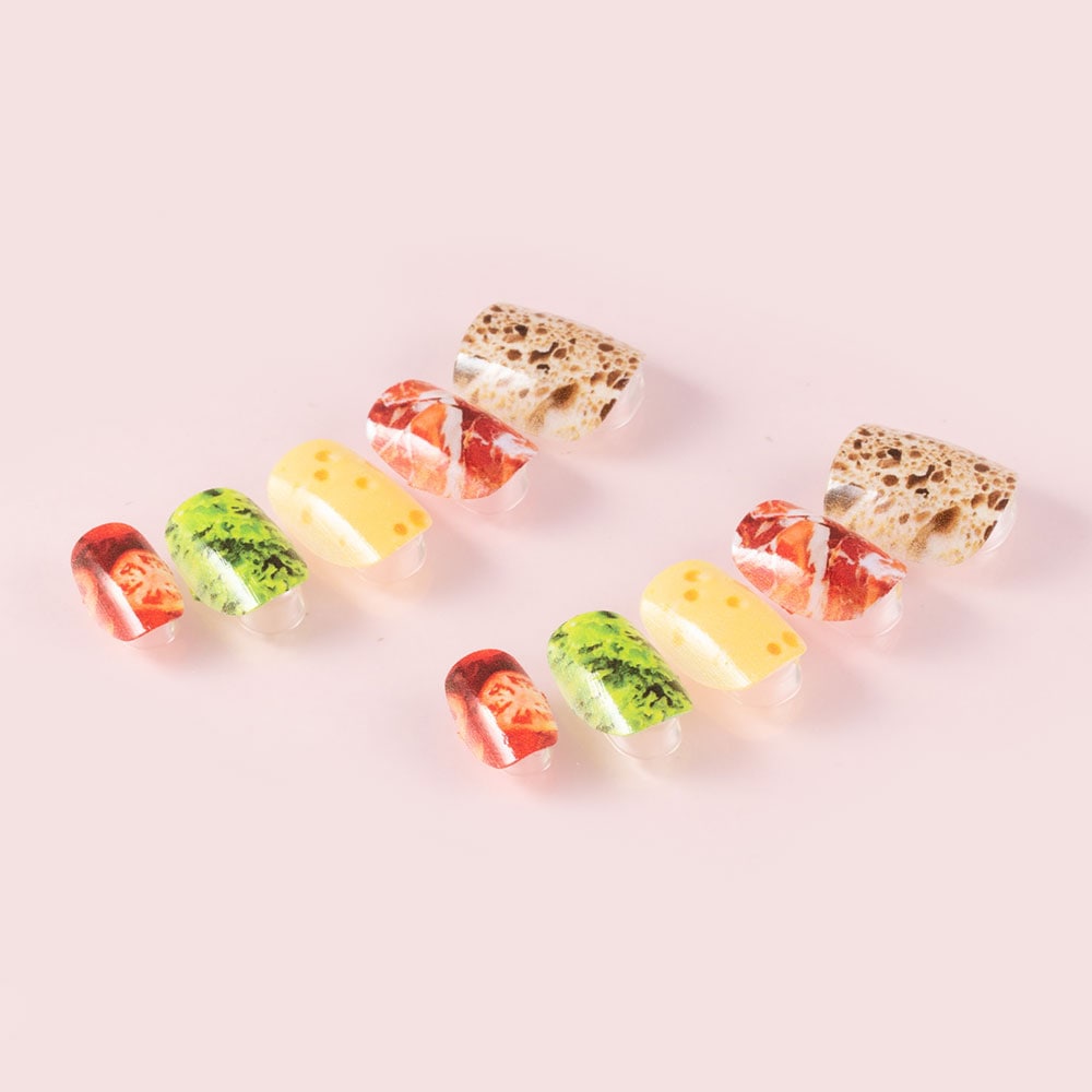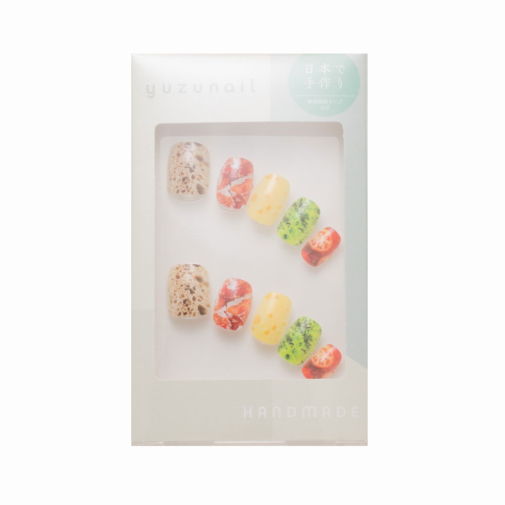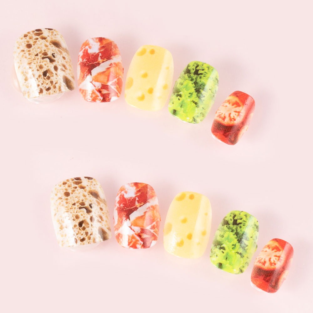 (形)スクエアショート(デザイン)サンドイッチの色鮮やかなネイル。親指はパン、人差し指は生ハム、、、続いてチーズレタストマトです。トップコート:ゆずネイル特製のジェルコーティングです。肉厚でぷるんとした質感で、柔らかく着け心地が良いです。ご利用シーン:。