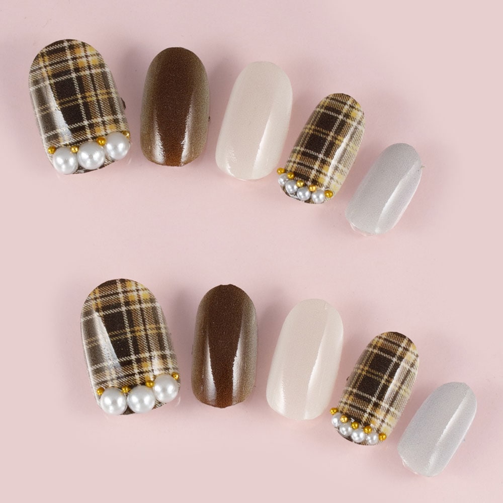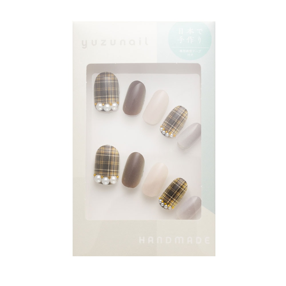 (形)ラウンド(デザイン)ブラウンチェックのほっこりネイル。トップコート:ゆずネイル特製のジェルコーティングです。肉厚でぷるんとした質感で、柔らかく着け心地が良いです。ご利用シーン:デート 。