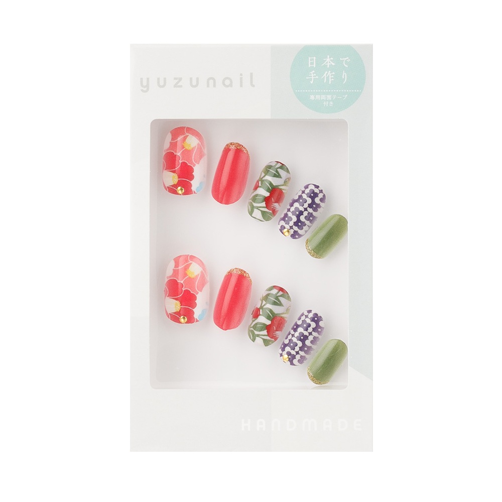 (形)ラウンド(デザイン)キッチュな和ネイル。トップコート:ゆずネイル特製のジェルコーティングです。肉厚でぷるんとした質感で、柔らかく着け心地が良いです。ご利用シーン:成人式・振袖 浴衣 。