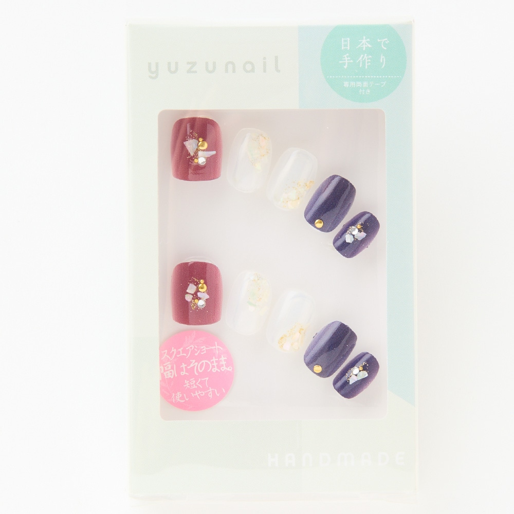 (形)スクエアショート(デザイン)ボルドーとネイビーのシェルネイル。トップコート:ゆずネイル特製のジェルコーティングです。肉厚でぷるんとした質感で、柔らかく着け心地が良いです。ご利用シーン:デート ドレス 結婚式(お呼ばれ・ゲスト) 。