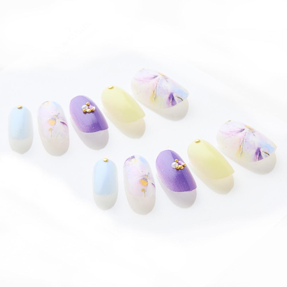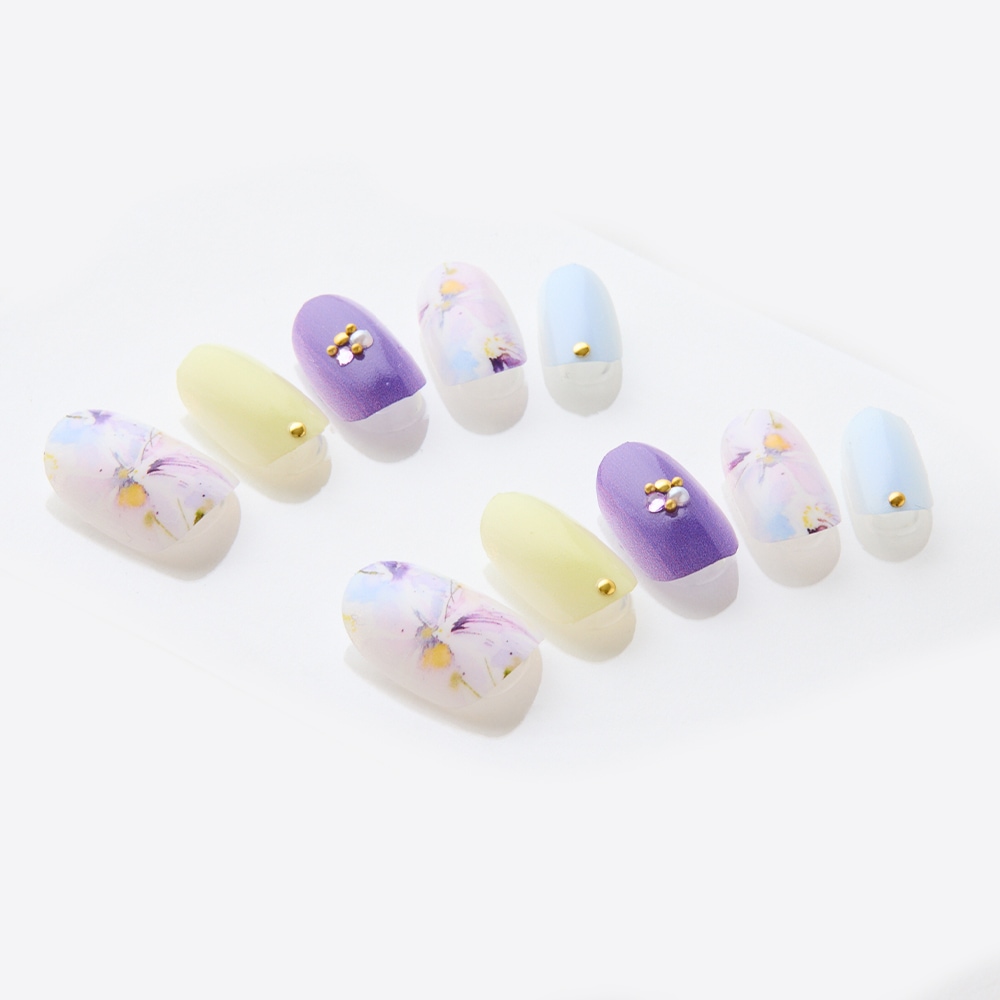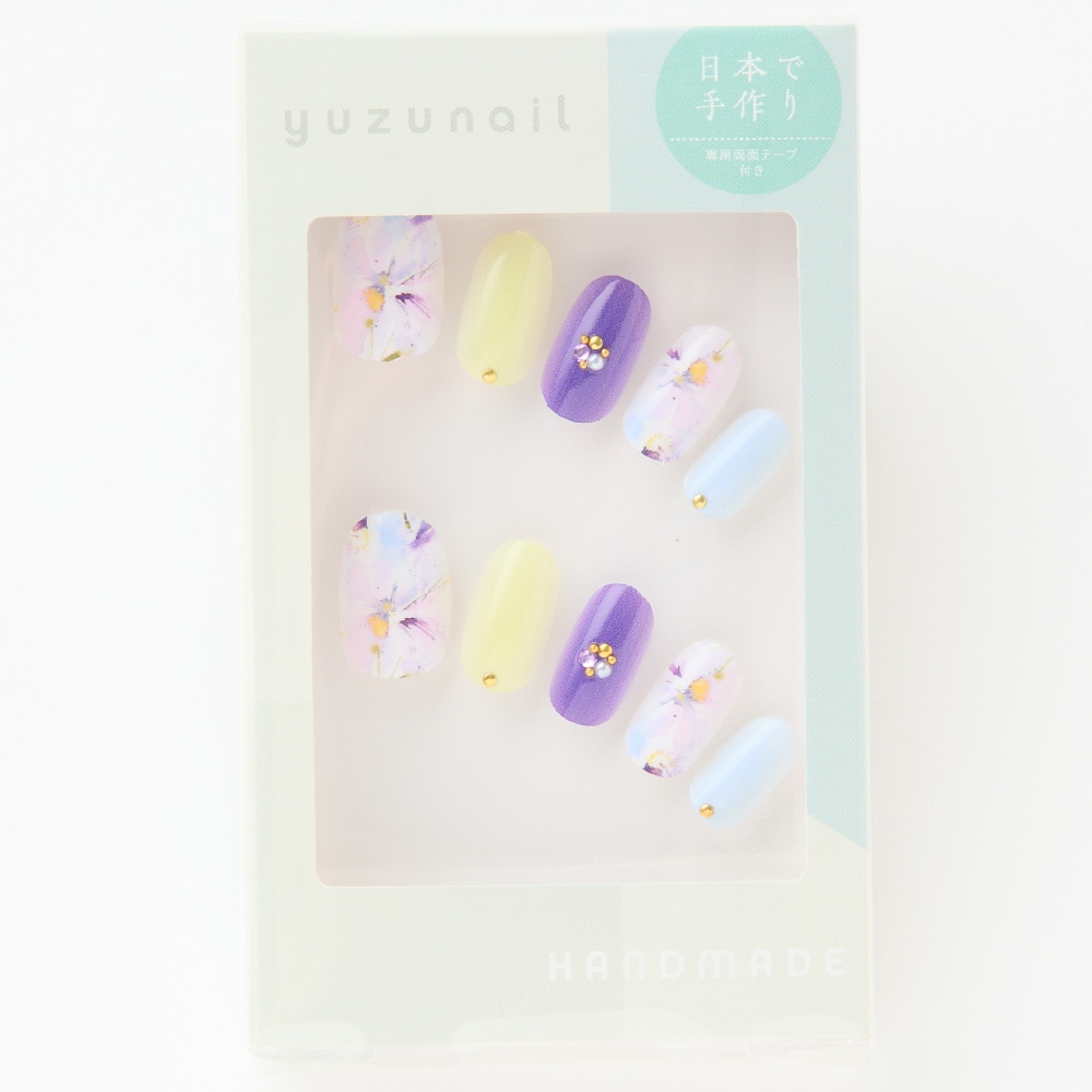 (形)ラウンド(デザイン)水彩ペイント風の優しいお花柄ネイル。トップコート:ゆずネイル特製のジェルコーティングです。肉厚でぷるんとした質感で、柔らかく着け心地が良いです。ご利用シーン:デート ドレス 結婚式(お呼ばれ・ゲスト) 。