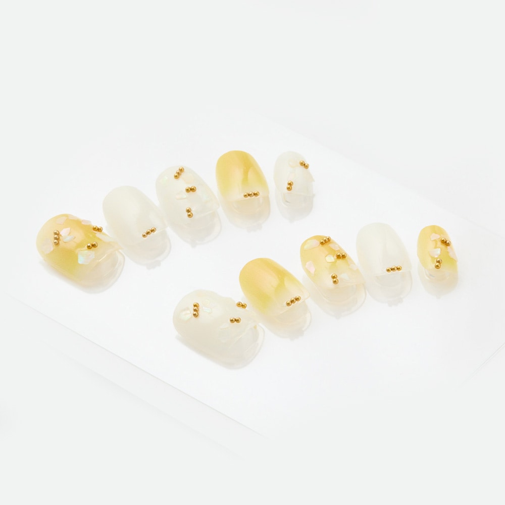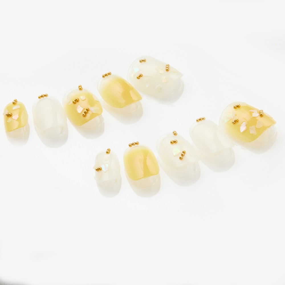 (形)スクエアショート(デザイン)からし色とクリーム色の優しいアートトップコート:ゆずネイル特製のジェルコーティングです。肉厚でぷるんとした質感で、柔らかく着け心地が良いです。ご利用シーン:デート ドレス 結婚式(お呼ばれ・ゲスト) 。