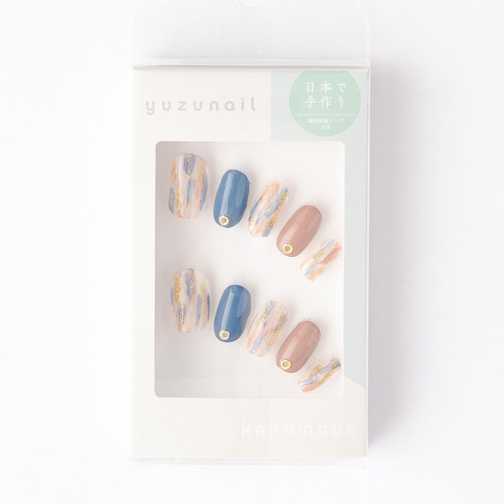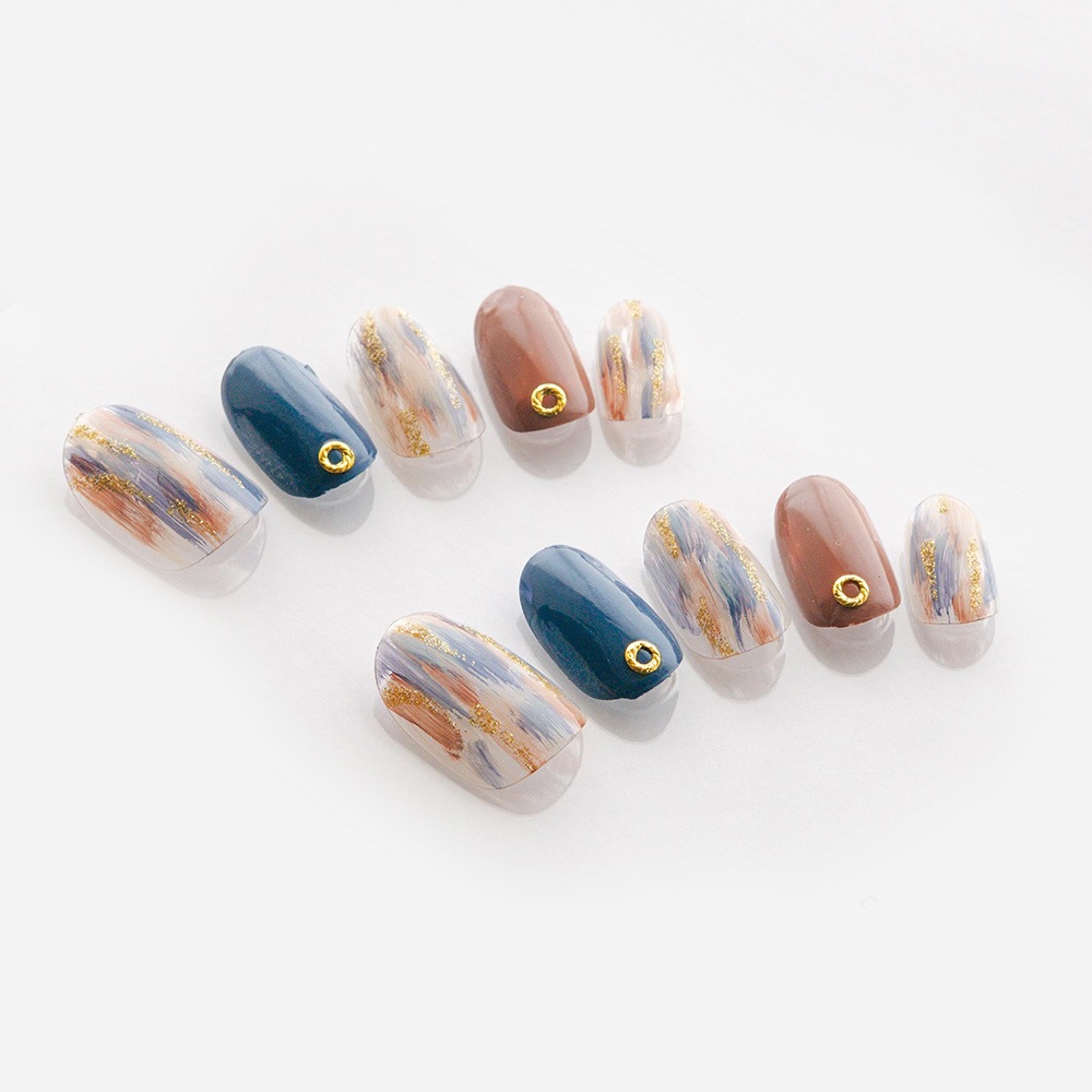 (形)ラウンド(デザイン)コーヒーとアッシュブルーのブラッシュアートトップコート:ゆずネイル特製のジェルコーティングです。肉厚でぷるんとした質感で、柔らかく着け心地が良いです。ご利用シーン:デート ドレス 結婚式(お呼ばれ・ゲスト) 。