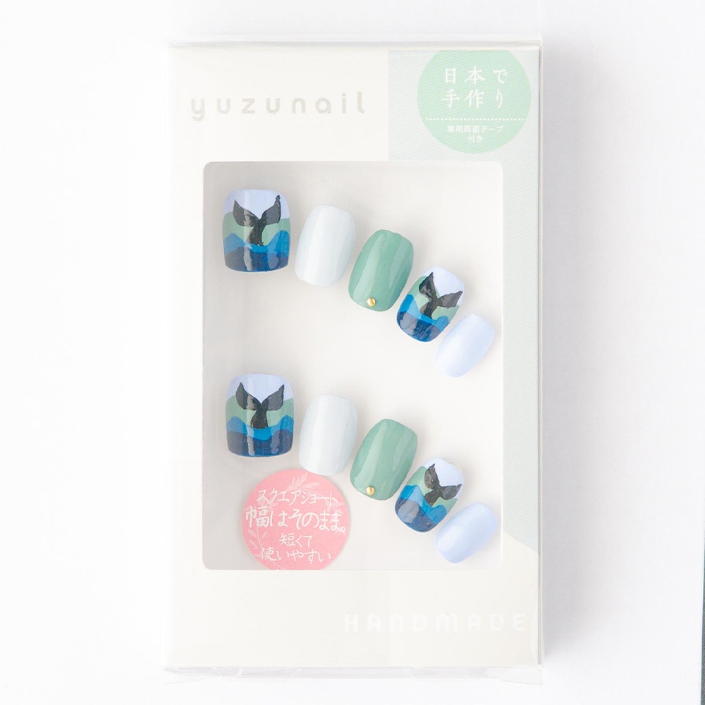 (形)スクエアショート(デザイン)かわいいクジラの海ネイル。トップコート:ゆずネイル特製のジェルコーティングです。肉厚でぷるんとした質感で、柔らかく着け心地が良いです。ご利用シーン:デート 海 。
