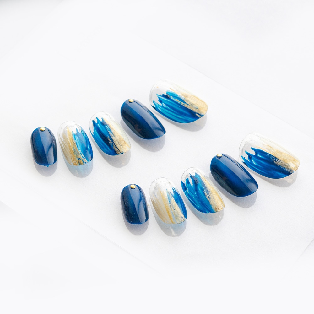 (形)ラウンド(デザイン)塗りかけブルーとゴールド。トップコート:ゆずネイル特製のジェルコーティングです。肉厚でぷるんとした質感で、柔らかく着け心地が良いです。ご利用シーン:デート ドレス 結婚式(お呼ばれ・ゲスト) 。