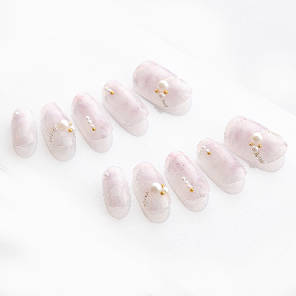 (形)ラウンド(デザイン)パールのアクセサリーのようなネイル。トップコート:ゆずネイル特製のジェルコーティングです。肉厚でぷるんとした質感で、柔らかく着け心地が良いです。ご利用シーン:デート ドレス 。
