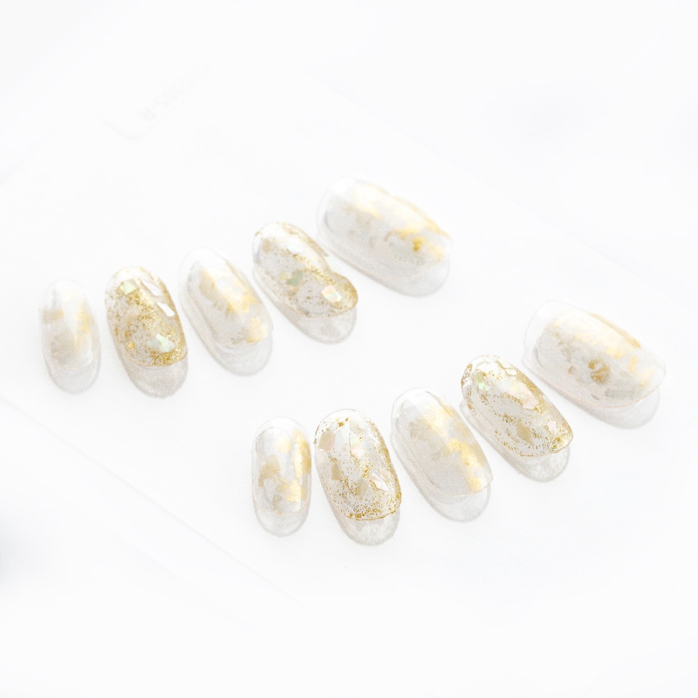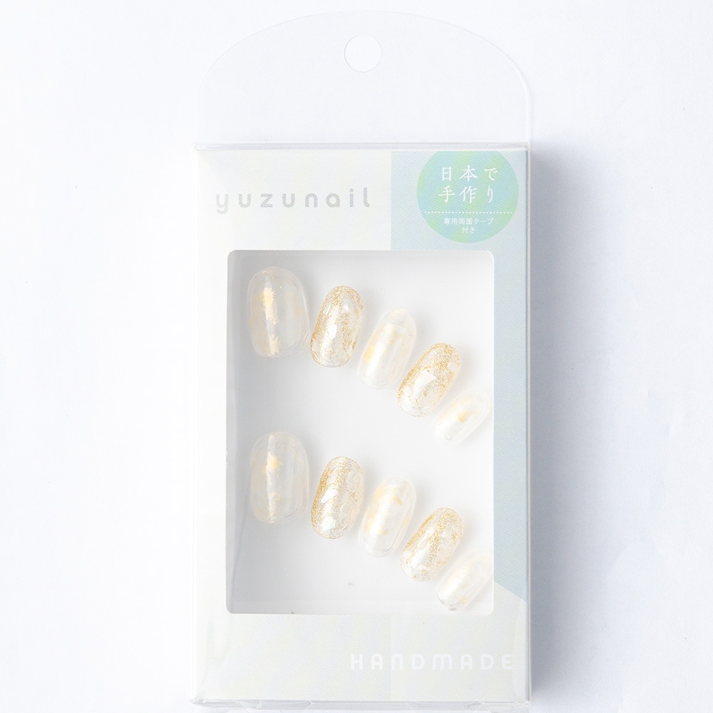 (形)ラウンド(デザイン)ホワイトとゴールドのニュアンスシェルトップコート:ゆずネイル特製のジェルコーティングです。肉厚でぷるんとした質感で、柔らかく着け心地が良いです。ご利用シーン:デート ドレス 結婚式(お呼ばれ・ゲスト) 。